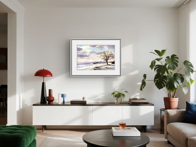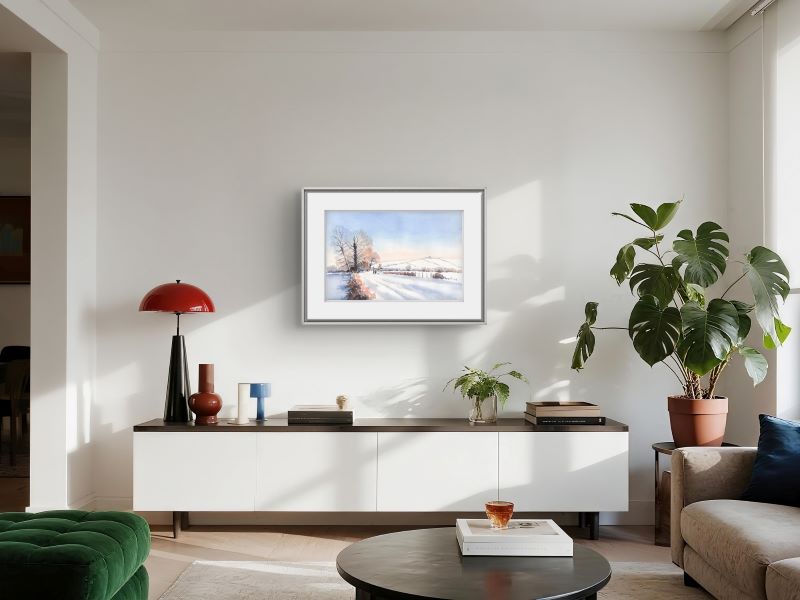 This serene watercolour depicts a tranquil winter scene in Bempton. A snow-covered path leads toward a distant church and a...