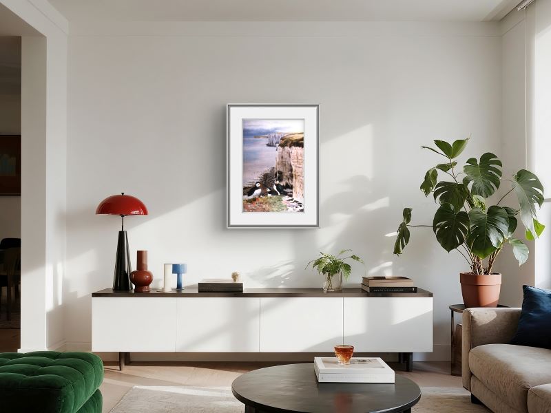 A print of puffins perched on the rugged edges of towering cliffs, full of life and character. The painting captures...
