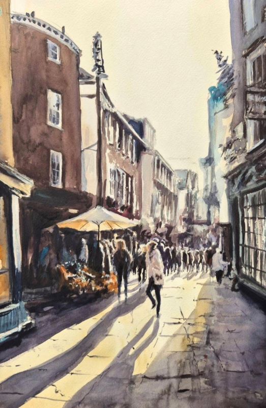 This vibrant watercolour captures the timeless energy of York's historic streets. The scene is alive with the movement of figures...