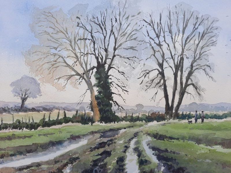 This evocative landscape captures the feeling of a brisk country walk on a frosty day. Bare trees and a winding...