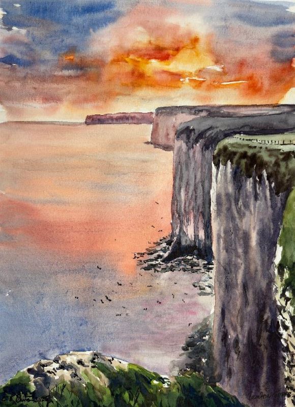 Bathed in golden hues, this painting captures the glowing light of sunset falling across Bempton Cliffs—one of the UK’s most...