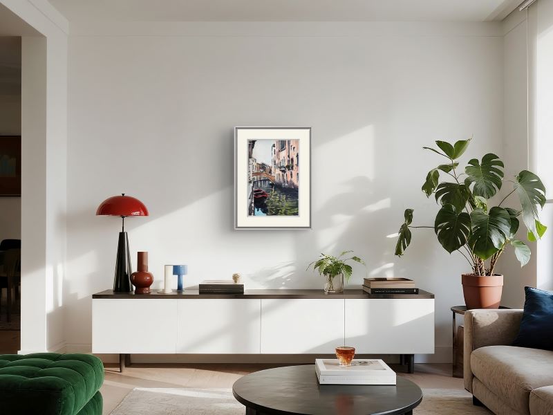 An intimate scene from the quieter corners of Venice, this painting captures the charm of a lesser-known canal flanked by warm-toned buildings. The still water mirrors the reflections of old walls and a resting gondola, evoking the timeless romance of Venetian waterways.