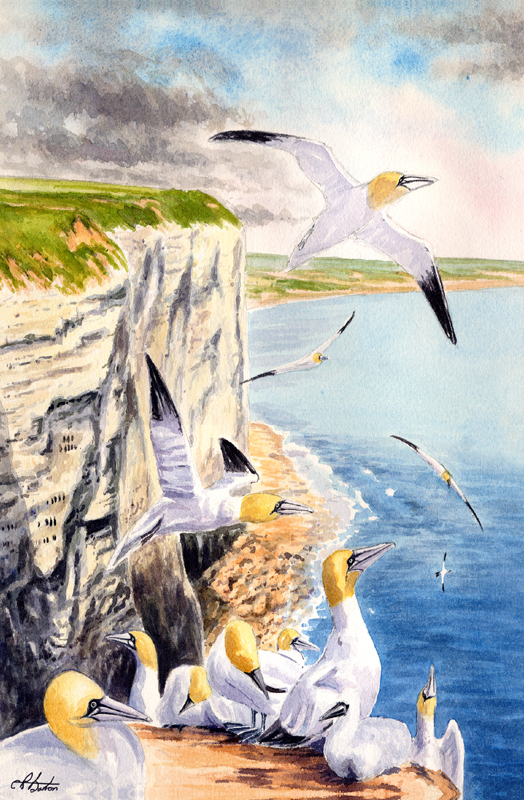 A print of gannets wheeling above their biggest mainland breeding colony in England – Bempton Cliffs, painted with energy and movement. The work captures the wild spirit of the coast.