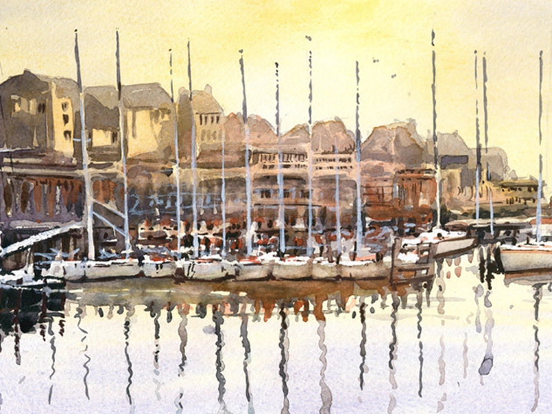 A beautiful sunrise illuminating Bridlington Harbour, reflecting off the water and the boats moored within it. The use of a warm, gentle palette captures the early morning light as it silhouettes the masts of the sailboats against the sky.
