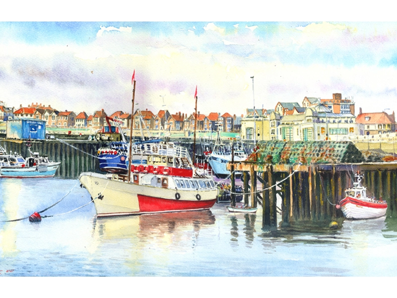 A vibrant painting of Bridlington Harbour is full of life and colour. It features fishing boats and other vessels at rest, their reflections shimmering on the water, with the town’s seaside architecture providing a bustling backdrop.